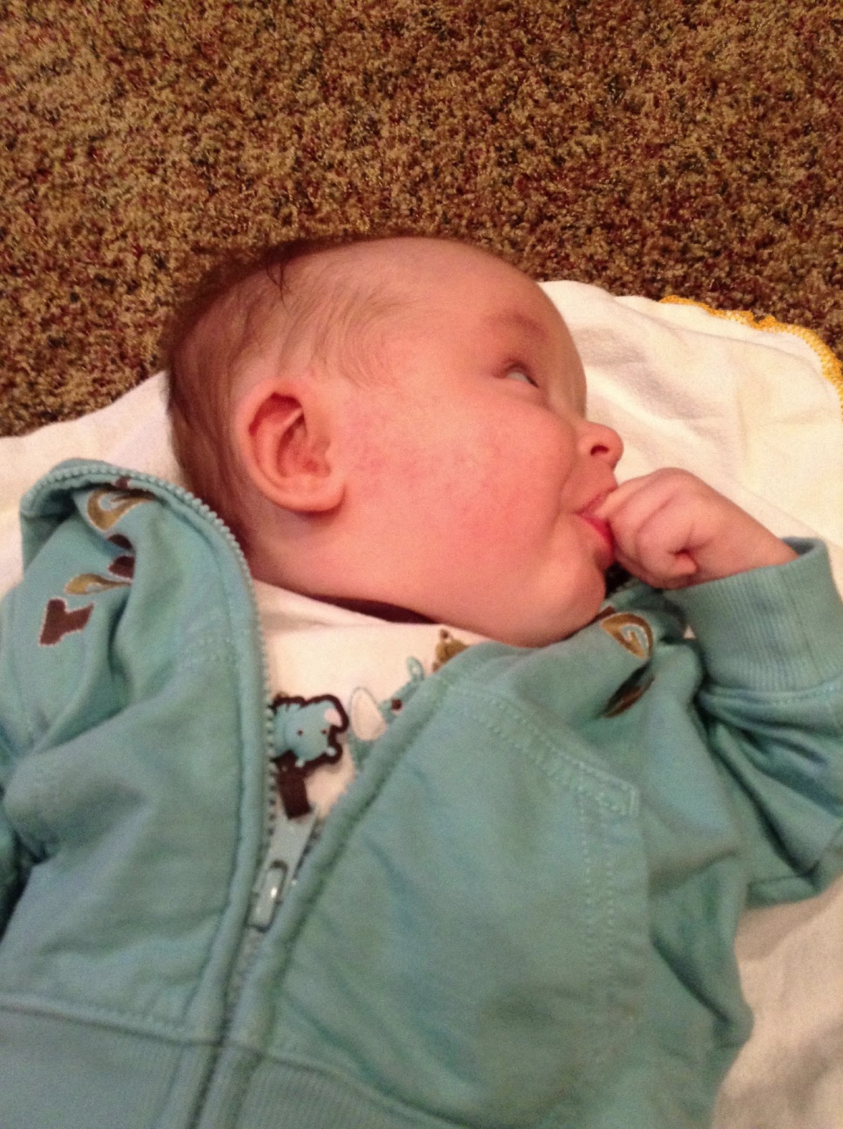 He is still a doll and a pretty easy-going kid. We love this little boy! His very favorite activity is to be on the floor playing with his hands. He tolerates tummy time pretty well, and can hold his head up during that also.